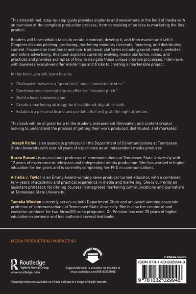 Readers will learn what it takes to create a concept, develop it, and then market and sell it. Chapters discuss pitching, producing, marketing visionary concepts, financing, and distributing content. Focused on traditional and non-traditional platforms including social media, websites, and online advertising, this book explores currently evolving media platforms, ideas, and practices and provides examples of how to navigate these unique creative processes. Interviews with business executives offer insider tips and tricks to creating a marketable project.