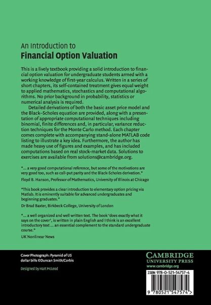 This is a lively textbook providing a solid introduction to financial option valuation for undergraduate students armed with a working knowledge of a first year calculus. Written in a series of short chapters, its self-contained treatment gives equal weight to applied mathematics, stochastics and computational algorithms. No prior background in probability, statistics or numerical analysis is required. Detailed derivations of both the basic asset price model and the Black-Scholes equation are provided along with a presentation of appropriate computational techniques including binomial, finite differences and in particular, variance reduction techniques for the Monte Carlo method. Each chapter comes complete with accompanying stand-alone MATLAB code listing to illustrate a key idea. Furthermore, the author has made heavy use of figures and examples, and has included computations based on real stock market data.