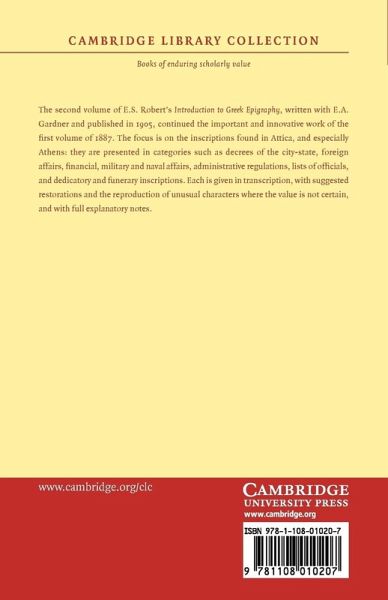 The second volume of E. S. Robert's Introduction to Greek Epigraphy, written with E. A. Gardner and published in 1905, continued the important and innovative work of the first volume of 1887. The focus is on the inscriptions found in Attica, and especially Athens: they are presented in categories such as decrees of the city-state, foreign affairs, financial, military and naval affairs, administrative regulations, lists of officials, and dedicatory and funerary inscriptions. Each is given in transcription, with suggested restorations and the reproduction of unusual characters where the value is not certain, and with full explanatory notes.