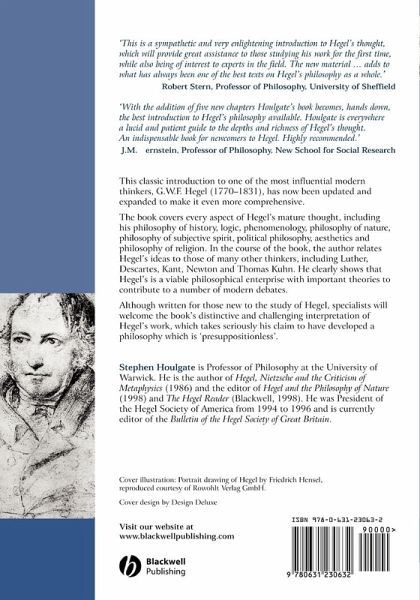'With the addition of five new chapters Houlgate'sbook becomes, hands down, the best introduction to Hegel'sphilosophy available. Houlgate is everywhere a lucid and patientguide to the depths and richness of Hegel's thought. Anindispensable book for newcomers to Hegel. Highlyrecommended.' J. M. Bernstein, New School for SocialResearch