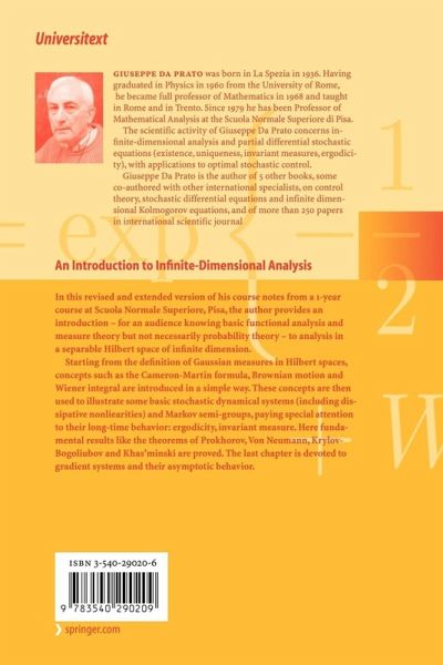 "The present volume collects together ... the notes of the course on infinite-dimensional analysis held by the author at the Scuola Normale Superiore of Pisa in recent years. The book is intended for people who have some knowledge of functional analysis ... . It provides an extremely useful tool for those scholars who are interested in learning some basics about Gaussian measures in Hilbert spaces, Brownian motion, Markov transition semigroups ... . The book is well written and all arguments are clearly and rigorously presented." (Sandra Cerrai, Mathematical Reviews, Issue 2009 a)