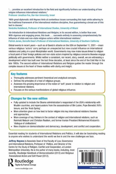 Not so very long ago it seemed reasonable to assert that the influence of religion on global politics was on the wane. As the Western world became increasingly secular and the process of globalisation deepened, it seemed inevitable - on the surface at least - that the voice of religion was to be heard softly if it was to be heard at all. This has now changed, and changed perhaps irrevocably. As Jeff Haynes argues in this thought-provoking and important new book, various religious 'actors' are now significantly involved in international relations and have become a crucial influence on policy in a post-Westphalian world. International Relations and Religion guides the reader through the complex issues at the heart of this topic with clarity and insight. This updated second edition starts with a close reading of the many theoretical and analytical concepts - notably Huntington and the clash of civilisations - that have grown up around this area and then concludes with a summary of the issues under discussion and attempts to put into context what it means to live in a world that is increasingly shaped by a whole host of diverse religious groups. Essential reading for students of International Relations and Politics.