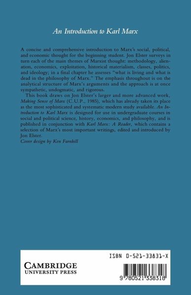 A concise and comprehensive introduction to Marx's social, political, and economic thought for the beginning student. The author surveys in turn each of the main themes of Marxist thought: methodology, alienation, economics, exploitation, historical materialism, classes, politics, and ideology; in a final chapter he assesses 'what is living and what is dead in the philosophy of Marx.'