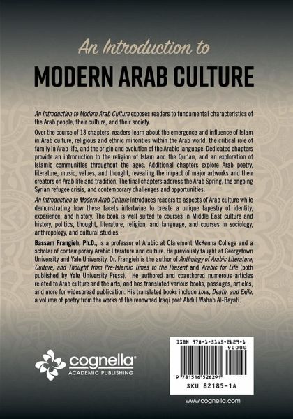 An Introduction to Modern Arab Culture exposes readers to fundamental characteristics of the Arab people, their culture, and their society. Over the course of 13 chapters, readers learn about the emergence and influence of Islam in Arab culture, religious and ethnic minorities within the Arab world, the critical role of family in Arab life, and the origin and evolution of the Arabic language. Dedicated chapters provide an introduction to the religion of Islam and the Qur’an, and an exploration of Islamic communities throughout the ages. Additional chapters explore Arab poetry, literature, music, values, and thought, revealing the impact of major artworks and their creators on Arab life and tradition. The final chapters address the Arab Spring, the ongoing Syrian refugee crisis, and contemporary challenges and opportunities. An Introduction to Modern Arab Culture introduces readers to aspects of Arab culture while demonstrating how these facets intertwine to create a unique tapestry of identity, experience, and history. The book is well suited to courses in Middle East culture and history, politics, thought, literature, religion, and language, and courses in sociology, anthropology, and cultural studies. Bassam Frangieh, Ph.D., is a professor of Arabic at Claremont McKenna College and a scholar of contemporary Arabic literature and culture. He previously taught at Georgetown University and Yale University. Dr. Frangieh is the author of Anthology of Arabic Literature, Culture, and Thought from Pre-Islamic Times to the Present and Arabic for Life (both published by Yale University Press). He authored and coauthored numerous articles related to Arab culture and the arts, and has translated various books, passages, articles, and more for widespread publication. His translated books include Love, Death, and Exile, a volume of poetry from the works of the renowned Iraqi poet Abdul Wahab Al-Bayati.