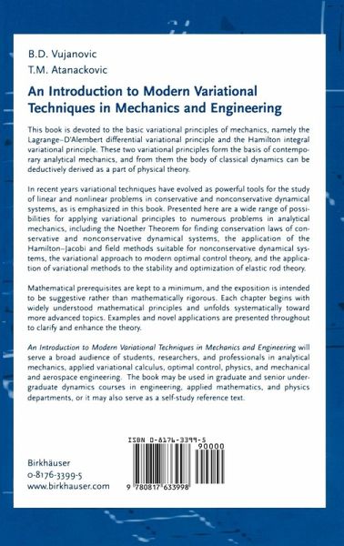 This book is devoted to the basic variational principles of mechanics: the Lagrange-D'Alembert differential variational principle and the Hamilton integral variational principle. These two variational principles form the main subject of contemporary analytical mechanics, and from them the whole colossal corpus of classical dynamics can be deductively derived as a part of physical theory. In recent years students and researchers of engineering and physics have begun to realize the utility of variational principles and the vast possi bilities that they offer, and have applied them as a powerful tool for the study of linear and nonlinear problems in conservative and nonconservative dynamical systems. The present book has evolved from a series of lectures to graduate stu dents and researchers in engineering given by the authors at the Depart ment of Mechanics at the University of Novi Sad Serbia, and numerous foreign universities. The objective of the authors has been to acquaint thereader with the wide possibilities to apply variational principles in numerous problems of contemporary analytical mechanics, for example, the Noether theory for finding conservation laws of conservative and nonconservative dynamical systems, application of the Hamilton-Jacobi method and the field method suitable for nonconservative dynamical systems,the variational approach to the modern optimal control theory, the application of variational methods to stability and determining the optimal shape in the elastic rod theory, among others.