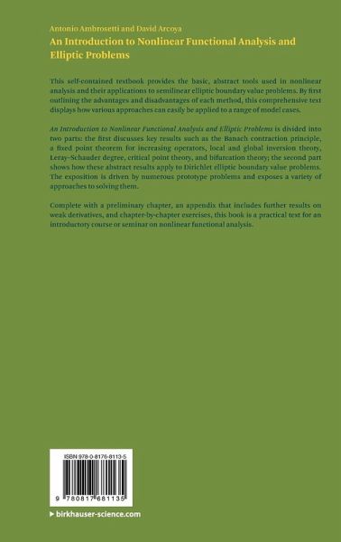 An Introduction to Nonlinear Functional Analysis and Elliptic Problems is divided into two parts: the first discusses key results such as the Banach contraction principle, a fixed point theorem for increasing operators, local and global inversion theory, Leray-Schauder degree, critical point theory, and bifurcation theory; the second part shows how these abstract results apply to Dirichlet elliptic boundary value problems. The exposition is driven by numerous prototype problems and exposes a variety of approaches to solving them.