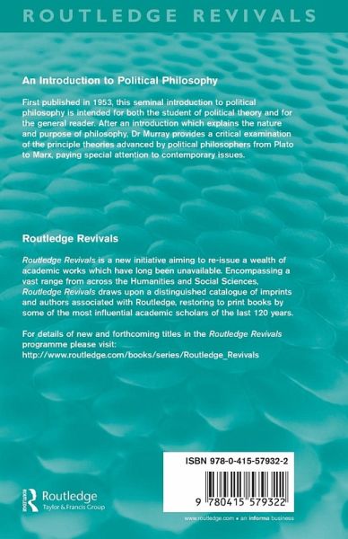 First published in 1953, this seminal introduction to political philosophy is intended for both the student of political theory and for the general reader. After an introduction which explains the nature and purpose of philosophy, Dr Murray provides a critical examination of the principle theories advanced by political philosophers from Plato to Marx, paying special attention to contemporary issues. The book also makes an attempt to define the essential issues of philosophical significance in contemporary politics, with special reference to the conflict between political authority and individual rights, and to show how the different moral assumptions underlying authoritarian and democratic systems of government are ultimately based upon different theories of logic.
