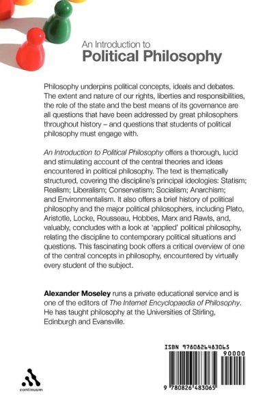 Philosophy underpins political concepts, ideals and debates. The extent and nature of our rights, liberties and responsibilities, the role of the state and the best means of its governance are all questions to have been addressed by great philosophers throughout history - and questions students of political philosophy must engage with. An Introduction to Political Philosophy offers a thorough, lucid and stimulating account of the central theories and ideas encountered in political philosophy. The text is thematically structured, covering the discipline's principal ideologies: Statism; Realism; Liberalism; Conservatism; Socialism; Anarchism; and Environmentalism. It also offers a brief history of political philosophy and the major political philosophers, including Plato, Aristotle, Locke, Rousseau, Hobbes, Marx and Rawls, and, valuably, concludes with a look at 'applied' political philosophy, relating the discipline to contemporary political situations and questions. This fascinating book offers a critical overview of one of the central concepts in philosophy, encountered by virtually every student of the subject.
