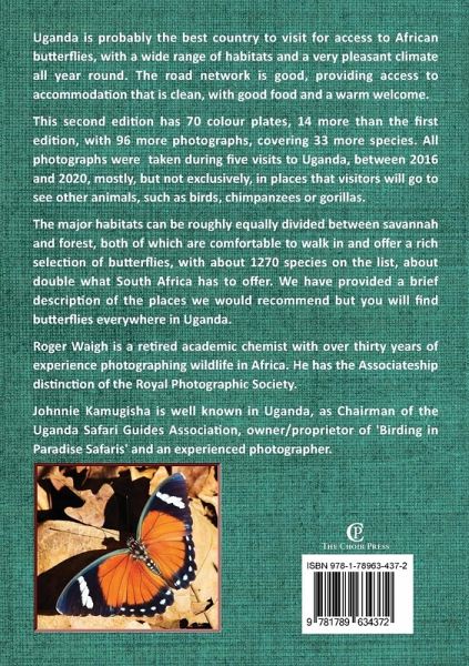 Uganda is probably the best country to visit for access to African butterflies, with a wide range of habitats and a very pleasant climate all year round. The road network is good, providing access to accommodation that is clean, with good food and a warm welcome. This second edition has 70 colour plates, 14 more than the first edition, with 96 more photographs, covering 33 more species. All photographs were taken during five visits to Uganda, between 2016 and 2020, mostly, but not exclusively, in places that visitors will go to see other animals, such as birds, chimpanzees or gorillas. The major habitats can be roughly equally divided between savannah and forest, both of which are comfortable to walk in and offer a rich selection of butterflies, with about 1270 species on the list, about double what South Africa has to offer. We have provided a brief description of the places we would recommend but you will find butterflies everywhere in Uganda.