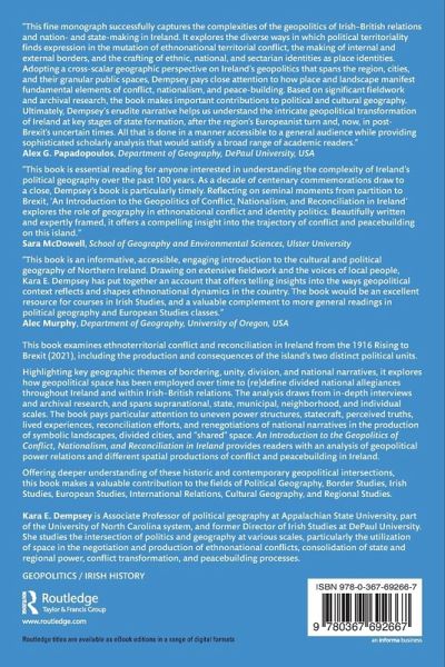 1.Foundations: Nationalist Struggles and Geopolitical Divisions. 2 .Contested Territorialities: The 1916 Rising and the Irish War of Independence. 3.Partition and Division: The Anglo-Irish Treaty, Civil War, and Ireland Divided. 4."The Troubles" Across Various Scales. 5.The Walls Within: Segregation, Peacelines, and Flags. 6.Ethnonational Spatial Strategies and Transgressions: Political Parades and Murals. 7.Hope for the Future I: "Shared" space in north Belfast. 8.Hope for the Future II: Employment of the Garden of Remembrance in the Republic of Ireland. Conclusion.Renegotiating National Memory and Brexit: An Uncertain Future in Ireland