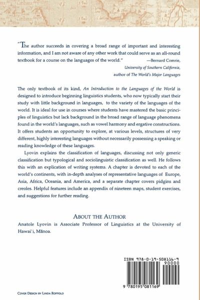 This is a text designed to introduce linguistic students to the variety of the languages of the world. He explains the classification of languages, of writing systems, and devotes a chapter to each of the world's continents.