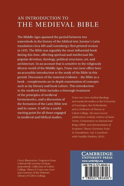 The Middle Ages spanned the period between two watersheds in the history of the biblical text: Jerome's Latin translation c.405 and Gutenberg's first printed version in 1455. The Bible was arguably the most influential book during this time, affecting spiritual and intellectual life, popular devotion, theology, political structures, art, and architecture. In an account that is sensitive to the religiously diverse world of the Middle Ages, Frans van Liere offers here an accessible introduction to the study of the Bible in this period. Discussion of the material evidence - the Bible as book - complements an in-depth examination of concepts such as lay literacy and book culture. This introduction includes a thorough treatment of the principles of medieval hermeneutics, and a discussion of the formation of the Latin bible text and its canon. It will be a useful starting point for all those engaged in medieval and biblical studies.