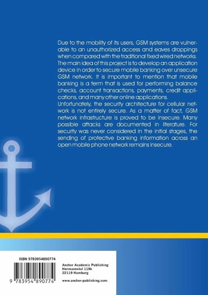 The main idea of this project is to develop an application device in order to secure mobile banking over unsecure GSM network. It is important to mention that mobile banking is a term that is used for performing balance checks, account transactions, payments, credit applications, and many other online applications. Unfortunately, the security architecture for cellular network is not entirely secure. As a matter of fact, GSM network infrastructure is proved to be insecure. Many possible attacks are documented in literature. For security was never considered in the initial stages, the sending of protective banking information across an open mobile phone network remains insecure.