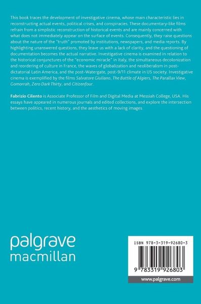 This book traces the development of investigative cinema, whose main characteristic lies in reconstructing actual events, political crises, and conspiracies. These documentary-like films refrain from a simplistic reconstruction of historical events and are mainly concerned with what does not immediately appear on the surface of events. Consequently, they raise questions about the nature of the "truth" promoted by institutions, newspapers, and media reports. By highlighting unanswered questions, they leave us with a lack of clarity, and the questioning of documentation becomes the actual narrative. Investigative cinema is examined in relation to the historical conjunctures of the "economic miracle" in Italy, the simultaneous decolonization and reordering of culture in France, the waves of globalization and neoliberalism in post-dictatorial Latin America, and the post-Watergate, post-9/11 climate in US society. Investigative cinema is exemplified by the films Salvatore Giuliano, The Battle of Algiers, The Parallax View, Gomorrah, Zero Dark Thirty, and Citizenfour.