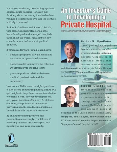 If you're considering developing a private general acute hospital-or even just thinking about becoming involved-then you need to determine whether the venture is likely to succeed. Arthur R. Ouellette and Steven J. Sobak, Two experienced professionals who have developed and managed hospitals throughout the world, highlight ten key considerations before making a final decision. If you move forward, you'll learn how to: design a proposed private hospital to maximize its operational success; deploy capital to improve the return on investment over the long term; promote positive relations between medical professionals and the community. Investors will discover the right questions to ask before committing money. Banks will get insights to help them determine whether to extend a loan. Project developers will get tips on boosting efficiency. Architects, students, and politicians involved in providing health-care facilities will also benefit from this important resource. By asking the right questions and proceeding accordingly, you'll know if investing in a new private hospital will benefit you and your community.