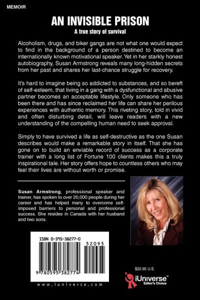 Alcoholism, drugs, and biker gangs are not what one would expect to find in the background of a person destined to become an internationally known motivational speaker.Yet in her starkly honest autobiography, Susan Armstrong reveals many long-hidden secrets from her past and shares her last-chance struggle for recovery. It's hard to imagine being so addicted to substances, and so bereft of self-esteem, that living in a gang with a dysfunctional and abusive partner becomes an acceptable lifestyle. Only someone who has been there and has since reclaimed her life can share her perilous experiences with authentic memory. This riveting story, told in vivid and often disturbing detail, will leave readers with a new understanding of the compelling human need to seek approval. Simply to have survived a life as self-destructive as the one Susan describes would make a remarkable story in itself. That she has gone on to build an enviable record of success as a corporate trainer with a long list of Fortune 100 clients makes this a truly inspirational tale. Her story offers hope to countless others who may feel their lives are without worth or promise.