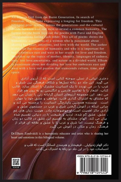 An Iranian Girl from the Burnt Generation, In search of Freedom, is a volume expressing a longing for freedom. This bilingual print reaches across the generations and the cultural divide between east and west to reveal a common humanity. The format for the book lays out the poems with Farsi and English interpretations facing each other. This set of poems shows the humanistic aspirations of a woman who is passionate about sharing her heart, emotions, and love with the world. The author highlights the oneness of humanity and why it is important for her to embrace east and west in her search for love and freedom. She takes up the topics of mother, identity, languages of sadness, love, lost love,uncertainty, and nature in a divided world. Elham is passionate about not dividing her love but embraces east and west with a love and passion that transcends culture, time, and space. ¿¿¿¿¿ ¿¿¿¿¿¿ ¿¿ ¿¿¿¿ ¿¿¿¿¿ ¿¿¿¿¿ ¿¿¿ ¿¿ ¿¿ ¿¿¿¿¿ ¿¿¿¿¿¿¿ ¿¿¿¿. ¿¿¿ ¿¿¿ ¿¿ ¿¿¿¿¿ ¿¿¿¿¿ ¿ ¿¿¿¿ ¿¿¿¿¿¿ ¿¿¿ ¿¿¿ ¿¿¿¿ ¿¿ ¿¿ ¿¿ ¿¿¿¿¿ ¿¿ ¿¿ ¿¿¿¿¿¿¿ ¿¿¿¿¿ ¿¿ ¿¿¿¿¿ ¿¿¿¿. ¿¿¿¿¿¿¿¿¿ ¿¿¿¿¿ ¿¿ ¿¿ ¿¿¿¿¿¿ ¿¿¿¿¿ ¿ ¿¿¿¿¿¿¿ ¿¿ ¿¿ ¿¿¿ ¿¿ ¿¿¿¿¿¿ ¿¿¿. ¿¿¿ ¿¿¿¿¿¿ ¿¿¿¿¿¿¿ ¿¿¿¿¿ ¿¿¿¿¿¿¿ ¿¿¿ ¿¿ ¿¿¿¿ ¿¿ ¿¿¿¿¿ ¿¿¿¿¿ ¿¿ ¿¿¿¿¿¿ ¿¿¿¿¿ ¿¿¿¿ ¿¿¿¿¿ ¿ ¿¿¿ ¿¿¿ ¿¿ ¿¿¿¿¿¿¿. ¿¿¿¿¿¿¿ ¿¿¿¿¿¿ ¿¿¿¿¿¿¿¿ ¿¿¿¿¿¿¿ ¿¿ ¿¿¿¿¿¿ ¿¿ ¿¿¿ ¿¿¿¿¿¿ ¿¿¿¿¿ ¿¿ ¿¿¿¿ ¿¿¿¿¿ ¿¿¿ ¿ ¿¿¿ ¿¿ ¿¿¿¿¿¿ ¿¿¿ ¿¿¿¿¿¿ ¿¿¿¿ ¿¿¿¿¿ ¿¿¿.¿¿ ¿¿¿¿¿¿¿ ¿¿¿¿¿ ¿¿¿¿ ¿¿¿¿¿ ¿¿¿ ¿¿¿ ¿¿¿¿ ¿¿¿ ¿¿ ¿¿¿¿ ¿¿¿¿¿ ¿ ¿¿¿¿¿ ¿¿ ¿¿ ¿¿¿¿¿¿ ¿¿¿¿¿ ¿¿¿¿¿¿¿ ¿¿ ¿¿¿. ¿¿¿¿¿¿ ¿¿¿¿¿ ¿¿ ¿¿¿¿¿ ¿¿¿ ¿¿¿ ¿¿ ¿¿¿¿ ¿¿ ¿¿¿¿¿ ¿¿¿¿¿ ¿¿¿¿¿ ¿¿¿ ¿¿¿ ¿ ¿¿¿ ¿¿ ¿¿ ¿¿¿ ¿ ¿¿¿¿¿ ¿¿ ¿¿¿¿¿ ¿¿.¿¿¿¿¿¿ ¿¿¿¿ ¿ ¿¿¿¿ ¿¿ ¿¿¿¿ ¿¿ ¿¿¿¿.