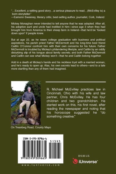 "...Excellent, a rattling good story...a serious pleasure to read...(McEvilley is) a born storyteller." --Eamonn Sweeney, literary critic, best-selling author, journalist, Cork, Ireland Mickey Monaghan never intended to tell anyone that he was adopted. After all, his adoptive aunt and uncle had instilled in him--since age 3 when they had brought him from America to their sheep farm in Ireland--that he'd be "looked down upon" if people knew. But at age 22, as he nears college graduation with business and political aspirations, his parish priest Father McDermott and his long-time best friend Caitlin O'Connor confront him with their own concerns for his future. Father McDermott is troubled by Mickey's philandering lifestyle, and Caitlin by an oddly disturbing slip of his tongue about family secrets; and both Father McDermott and Caitlin can see what Mickey won't--that he and Caitlin belong together. Add in a death at Mickey's hands and his reckless tryst with a married woman, and he's ready to open up. Alas, his own secrets lead to others--and to a tale more startling than any of them had imagined.