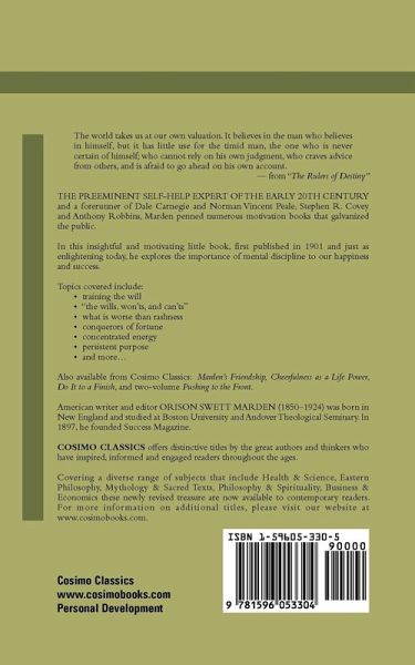 The world takes us at our own valuation. It believes in the man who believes in himself, but it has little use for the timid man, the one who is never certain of himself; who cannot rely on his own judgment, who craves advice from others, and is afraid to go ahead on his own account. -from "The Rulers of Destiny" The preeminent self-help expert of the early 20th century and a forerunner of Dale Carnegie and Norman Vincent Peale, Stephen R. Covey and Anthony Robbins, Marden penned numerous motivation books that galvanized the public. In this insightful and motivating little book, first published in 1901 and just as enlightening today, he explores the importance of mental discipline to our happiness and success. Topics covered include: . training the will . "the wills, won'ts, and can'ts" . what is worse than rashness . conquerors of fortune . concentrated energy . persistent purpose . and more. Also available from Cosimo Classics: Marden's Friendship, Cheerfulness as a Life Power, Do It to a Finish, and two-volume Pushing to the Front. American writer and editor ORISON SWETT MARDEN (1850-1924) was born in New England and studied at Boston University and Andover Theological Seminary. In 1897, he founded Success Magazine.