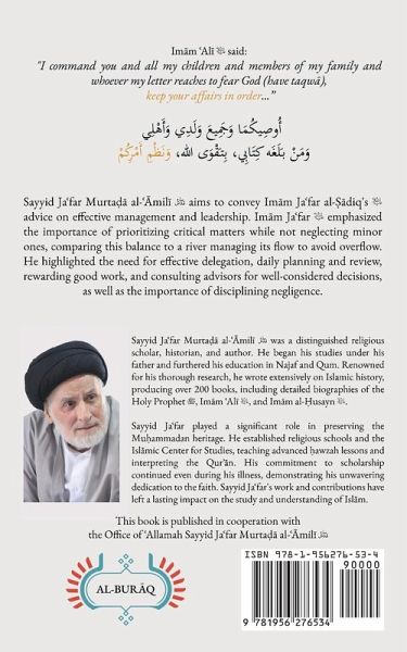 Im¿m ¿Al¿ (as) said: "I command you and all my children and members of my family and whoever my letter reaches to fear God (have taqw¿), keep your affairs in order, and maintain good relations among yourselves." ¿¿¿¿¿¿¿¿¿¿¿ ¿¿¿¿¿¿¿¿¿ ¿¿¿¿¿¿¿ ¿¿¿¿¿¿¿¿¿ ¿¿¿¿¿¿ ¿¿¿¿¿¿¿ ¿¿¿¿¿¿¿¿¿ ¿¿¿¿¿¿¿¿¿ ¿¿¿¿¿ ¿¿¿¿¿¿¿¿ ¿¿¿¿¿¿¿¿¿¿¿ ¿¿¿¿¿¿¿¿¿ ¿¿¿¿¿ ¿¿¿¿¿¿¿¿¿¿ This text aims to convey Im¿m Jäfar al-¿¿diq's (as) advice on effective management and leadership. He emphasized the importance of prioritizing critical matters without neglecting minor ones, comparing this balance to managing a river's flow to avoid overflow. He highlighted the need for effective delegation, daily planning and review, rewarding good work, and consulting advisors for well-considered decisions, as well as the importance of disciplining negligence.