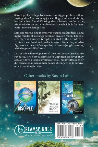 Sam, a geeky college freshman, has bigger problems than lusting after Marcus, sexy jock, college junior, and his big brother's best friend. Chasing after a beanie caught in the winter wind turns into a tumble down the rabbit hole for them both-science fiction style. Sam and Marcus find themselves trapped on a tropical island in the middle of a strange ocean on an alien moon. The sole structure is a ruined temple devoted to the art of love. Flustered, confused, and unable to return home, they need to figure out a means of escape from a hostile jungle teeming with dangerous life-forms. In this tale where opposites attract and secret crushes are revealed, two very dissimilar young men discover they actually have a lot in common after all, but it will take their differences as much as their points of connection to survive on an island in the stars.
