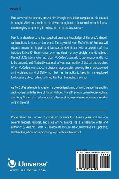 Max surveyed the scenery around him through dark Italian sunglasses. He paused in thought. What he knew in his head was enough to topple champion foosball players from glory to ignominy in an instant, or cause Jesus to cry. Max is a chauffeur who has acquired precious knowledge of his boss's diabolical intentions to conquer the world. The powerful Herr McCoffee of Eglicata will squash anyone in his path and has surrounded himself with a colorful staff that includes Sylvia Smitharomance who has slept her way straight into his cabinet, Manual McGetitdone who has ridden McCoffee's coattails to prominence and is not to be crossed, and Norbert Nodahead a "yes" man worthy of distrust and scrutiny. When McCoffee learns about a disadvantageous plant growing like a noxious weed on the distant island of Dalilennon that has the ability to keep his beautiful fowlawarfare alive, nothing will stop him from harvesting the crop. As McCoffee attempts to create his own defiant brand of world peace, he and his cabinet clash with the likes of Roger Rightjet, Priest Precious, Julian Knotsofoolista, and King Nocturnal in a humorous, allegorical journey where good-as it must-wins in the end.