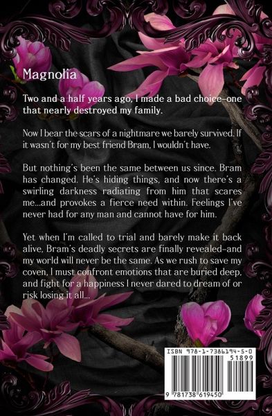 Magnolia Two and a half years ago, I made a bad choice-one that nearly destroyed my family. Now I bear the scars of a nightmare we barely survived. If it wasn't for my best friend Bram, I wouldn't have. But nothing's been the same between us since. Bram has changed. He's hiding things, and now there's a swirling darkness radiating from him that scares me...and provokes a fierce need within. Feelings I've never had for any man and cannot have for him. Yet when I'm called to trial and barely make it back alive, Bram's deadly secrets are finally revealed-and my world will never be the same. As we rush to save my coven, I must confront emotions that are buried deep, and fight for a happiness I never dared to dream of or risk losing it all...