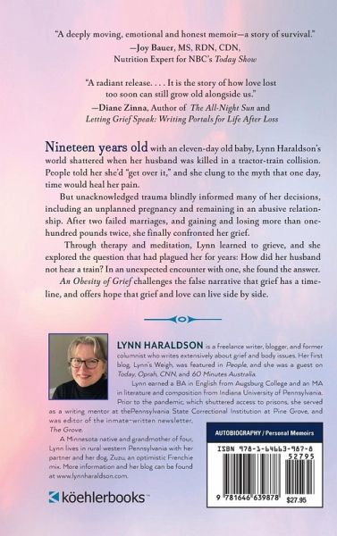 Nineteen years old with an eleven-day-old baby, Lynn Haraldson's world shatters when her husband, Bruce, is killed in a tractor-train collision. She clings to the myth that time will heal her pain, but unacknowledged trauma informs many of her decisions, including an unplanned pregnancy and remaining in an abusive relationship. After two failed marriages and gaining and losing more than a hundred pounds twice, a health scare forces her to confront her grief. Those in mourning often seek assurance that how they respond to grief also rings true for others. An Obesity of Grief challenges the false narrative that grief has a timeline and explores common reactions, offering hope that grief and love can live side by side.