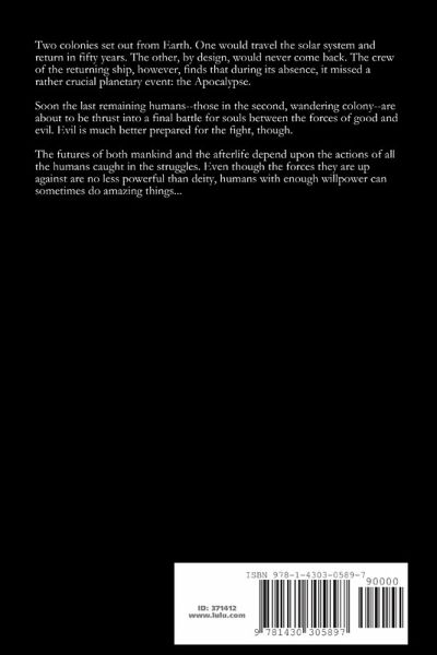 Two colonies set out from Earth. One would travel the solar system and return in fifty years. The other, by design, would never come back. The crew of the returning ship, however, finds that during its absence, it missed a rather crucial planetary event: the Apocalypse. Soon the last remaining humans--those in the second, wandering colony--are about to be thrust into a final battle for souls between the forces of good and evil. Evil is much better prepared for the fight, though. The futures of both mankind and the afterlife depend upon the actions of all the humans caught in the struggles. Even though the forces they are up against are no less powerful than deity, humans with enough willpower can sometimes do amazing things...
