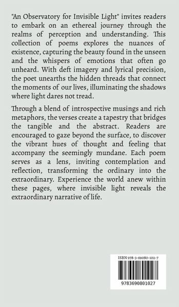 "An Observatory for Invisible Light" invites readers to embark on an ethereal journey through the realms of perception and understanding. This collection of poems explores the nuances of existence, capturing the beauty found in the unseen and the whispers of emotions that often go unheard. With deft imagery and lyrical precision, the poet unearths the hidden threads that connect the moments of our lives, illuminating the shadows where light dares not tread. Through a blend of introspective musings and rich metaphors, the verses create a tapestry that bridges the tangible and the abstract. Readers are encouraged to gaze beyond the surface, to discover the vibrant hues of thought and feeling that accompany the seemingly mundane. Each poem serves as a lens, inviting contemplation and reflection, transforming the ordinary into the extraordinary. Experience the world anew within these pages, where invisible light reveals the extraordinary narrative of life.
