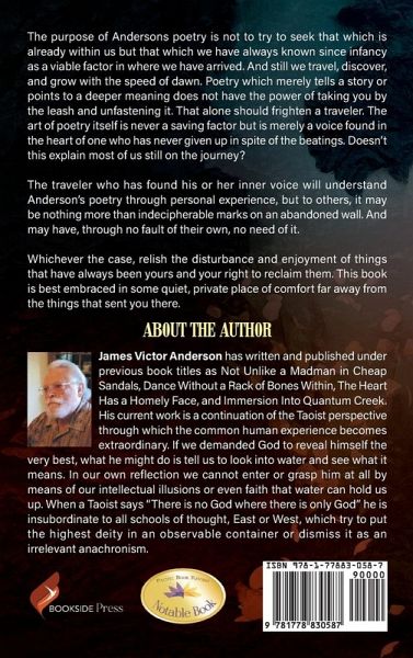 The purpose of Andersons poetry is not to try to seek that which is already within us but that which we have always known since infancy as a viable factor in where we have arrived. And still we travel, discover, and grow with the speed of dawn. Poetry which merely tells a story or points to a deeper meaning does not have the power of taking you by the leash and unfastening it. That alone should frighten a traveler. The art of poetry itself is never a saving factor but is merely a voice found in the heart of one who has never given up in spite of the beatings. Doesn't this explain most of us still on the journey? The traveler who has found his or her inner voice will understand Anderson's poetry through personal experience, but to others, it may be nothing more than indecipherable marks on an abandoned wall. And may have, through no fault of their own, no need of it. Whichever the case, relish the disturbance and enjoyment of things that have always been yours and your right to reclaim them. This book is best embraced in some quiet, private place of comfort far away from the things that sent you there.