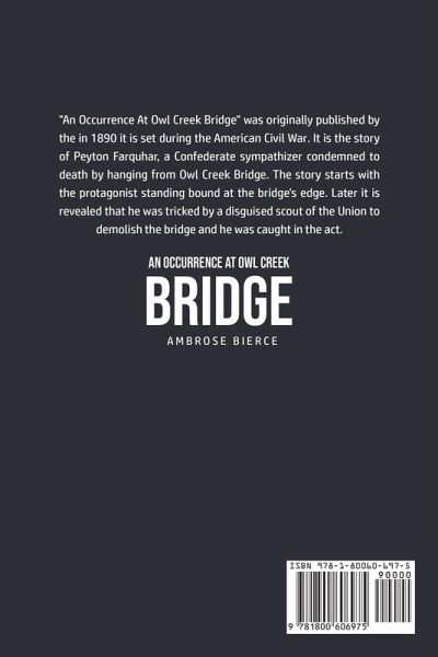 Do you want to read An Occurrence at Owl Creek Bridge? If so then keep reading... "An Occurrence At Owl Creek Bridge" was originally published by the in 1890 it is set during the American Civil War. It is the story of Peyton Farquhar, a Confederate sympathizer condemned to death by hanging from Owl Creek Bridge. The story starts with the protagonist standing bound at the bridge's edge. Later it is revealed that he was tricked by a disguised scout of the Union to demolish the bridge and he was caught in the act. What are you waiting for An Occurrence at Owl Creek Bridge is one click away, select the "Buy Now" button in the top right corner NOW!…mehr