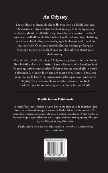Ceann de na heipicí is mó a bhfuil cáil air i gcónaí, leanann An Odyssey turas Odysseus agus é ag iarraidh filleadh abhaile tar éis Chogadh na Traí. Agus é ag dul i ngleic le créatúir mhiotasacha, déithe diongbháilte, agus fórsaí cinniúint, ní mór dó a bheith ag brath ar a choncing agus a athléimneacht chun a theaghlaigh a athaontú lena theaghlach agus a ríocht a athéileamh.Scéal eachtraíochta, dílseachta agus buanseasmhachta, scrúdaíonn An Odyssey na bua agus na trialacha ar an spiorad daonna. Ó na farraigí fealltach agus ó oileán na Cyclops go hallaí Ithaca, leanann clasaiceach buan Homer ar aghaidh ag tabhairt faoi léitheoirí lena n -áilleacht corraitheach agus a áilleacht fhileata.