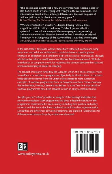 'An offer you can't refuse' compares, in depth, international 'work-for-welfare' (workfare) policies objectively for the first time. It considers well-publicised schemes from the United States alongside more overlooked examples of workfare in Britain, Denmark, France, Germany, The Netherlands and Norway.