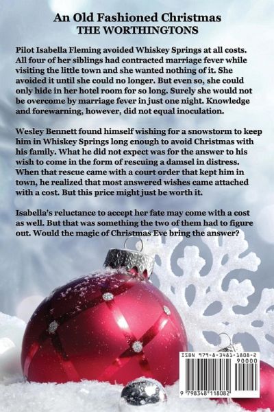 If Christmas magic was a town, it would be Whiskey Springs, Colorado. Pilot Isabella Fleming avoided Whiskey Springs at all costs. All four of her siblings had contracted marriage fever while visiting the little town and she wanted nothing of it. She avoided it until she could no longer. But even so, she could only hide in her hotel room for so long. Surely she would not be overcome by marriage fever in just one night. Knowledge and forewarning, however, did not equal inoculation. Wesley Bennett found himself wishing for a snowstorm to keep him in Whiskey Springs long enough to avoid Christmas with his family. What he did not expect was for the answer to his wish to come in the form of rescuing a damsel in distress. When that rescue came with a court order that kept him in town, he realized that most answered wishes came attached with a cost. But this price might just be worth it. Isabella's reluctance to accept her fate may come with a cost as well. But that was something the two of them had to figure out. Would the magic of Christmas Eve bring the answer? For a sparkling, snowy world of unexpected Christmas romance, family traditions and togetherness, plus the shimmering magic of love-at-first sight, read An Old Fashioned Christmas!