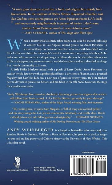 When a controversial rabbi drops dead over his matzoh ball soup at Canter's Deli in Los Angeles, retired private eye Amos Parisman is hired by the temple's board to make sure everything is kosher. As he looks into what seems to be a simple, tragic accident, Amos uncovers a world of treachery and hurt that shakes a large L.A. Jewish community to its core.