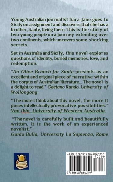 Critical praise for Antonio Casella's work ¿Casella's intention is to chart and illuminate undiscovered, difficult country... The characters are entirely, sometimes shockingly, believable, and even if they are unlikeable, there is a point of understanding and sympathy to which we are drawn. Helen Elliott, The Age, Melbourne Dream and ritual intersect with the real man, define the purpose of things. Walter Tonetto, The West Australian A beautifully crafted novel. Dianne Johnson, The Sydney Morning Herald Questa fusione di presente e passato, di nuovo e antico, di vicino e lontano, è la nota più caratteristica della scrittura di Antonio Casella. [This fusion of present and past, of new and old, of proximity and distance is the most important quality of Antonio Casella's writing.] Stefania Greco, in Terra e Identità Nella Narrativa Contemporanea Italo-Australiana dell'Emigrazione. 1999, University of Bologna About An Olive Branch for Sante An Olive Branch for Sante presents an excellent and original piece of narrative within the corpus of Australian literature ... The novel is a delight to read. Gaetano Rando, University of Wollongong The novel is carefully built and beautifully written. It is the work of an experienced novelist. Guido Bulla, University La Sapienza, Rome The more I think about this novel, the more it poses intellectually provocative possibilities. Van Ikin, University of Western Australia