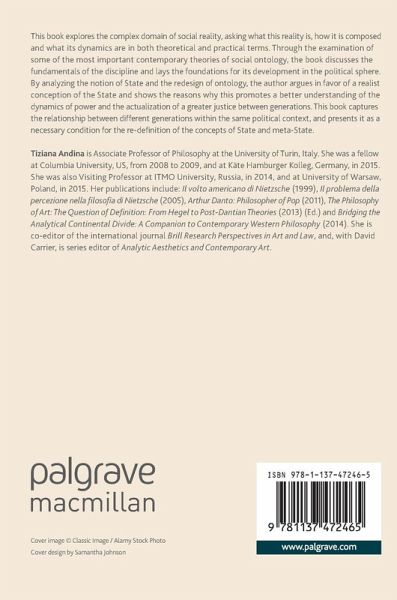 This book explores the complex domain of social reality, asking what this reality is, how it is composed and what its dynamics are in both theoretical and practical terms. Through the examination of some of the most important contemporary theories of social ontology, the book discusses the fundamentals of the discipline and lays the foundations for its development in the political sphere. By analyzing the notion of State and the redesign of ontology, the author argues in favor of a realist conception of the State and shows the reasons why this promotes a better understanding of the dynamics of power and the actualization of a greater justice between generations. This book captures the relationship between different generations within the same political context, and presents it as a necessary condition for the re-definition of the concepts of State and meta-State.
