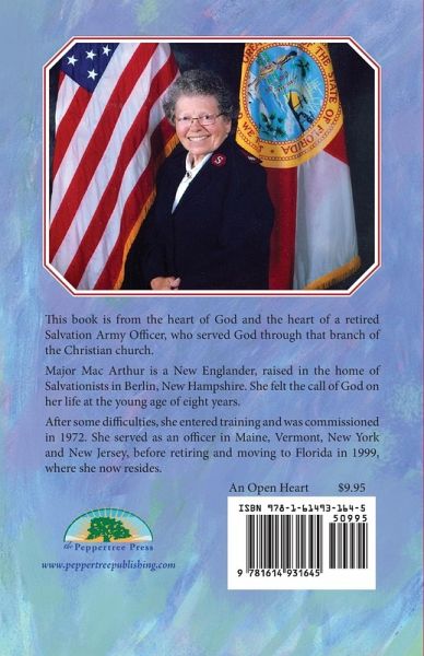 This book is from the heart of God and the heart of a retired Salvation Army Officer, who served God through that branch of the Christian church. Major Mac Arthur is a New Englander, raised in the home of Salvationists in Berlin, New Hampshire. She felt the call of God on her life at the young age of eight years. After some difficulties, she entered training and was commissioned in 1972. She served as an officer in Maine, Vermont, New York and New Jersey, before retiring and moving to Florida in 1999, where she now resides