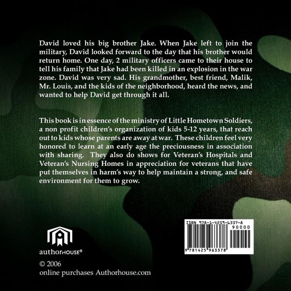David loved his big brother Jake. When Jake left to join the military, David looked forward to the day that his brother would return home. One day, 2 military officers came to their house to tell his family that Jake had been killed in an explosion in the war zone. David was very sad. His grandmother, best friend, Malik, Mr. Louis, and the kids of the neighborhood, heard the news, and wanted to help David get through it all. This book is in essence of the ministry of Little Hometown Soldiers, a non profit children's organization of kids 5-12 years, that reach out to kids whose parents are away at war. These children feel very honored to learn at an early age the preciousness in association with sharing. They also do shows for Veteran's Hospitals and Veteran's Nursing Homes in appreciation for veterans that have put themselves in harm's way to help maintain a strong, and safe environment for them to grow.