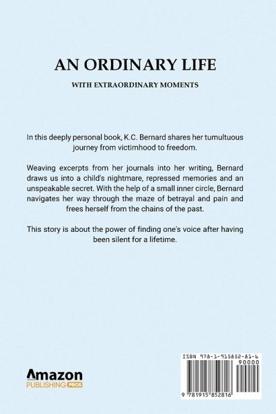 In this deeply personal book, K.C. Bernard shares her tumultuous journey from victimhood to freedom. Weaving excerpts from her journals into her writing, Bernard draws us into a child's nightmare, repressed memories and an unspeakable secret. With the help of a small inner circle, Bernard navigates her way through the maze of betrayal and pain and frees herself from the chains of the past. This story is about the power of finding one's voice after having been silent for a lifetime.