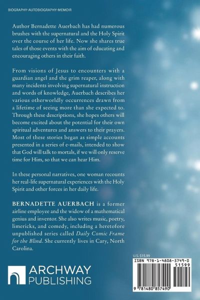 Author Bernadette Auerbach has had numerous brushes with the supernatural and the Holy Spirit over the course of her life. Now she shares true tales of those events with the aim of educating and encouraging others in their faith. From visions of Jesus to encounters with a guardian angel and the grim reaper, along with many incidents involving supernatural instruction and words of knowledge, Auerbach describes her various otherworldly occurrences drawn from a lifetime of seeing more than she expected to. Through these descriptions, she hopes others will become excited about the potential for their own spiritual adventures and answers to their prayers. Most of these stories began as simple accounts presented in a series of e-mails, intended to show that God will talk to mortals, if we will only reserve time for Him, so that we can hear Him. In these personal narratives, one woman recounts her real-life supernatural experiences with the Holy Spirit and other forces in her daily life.