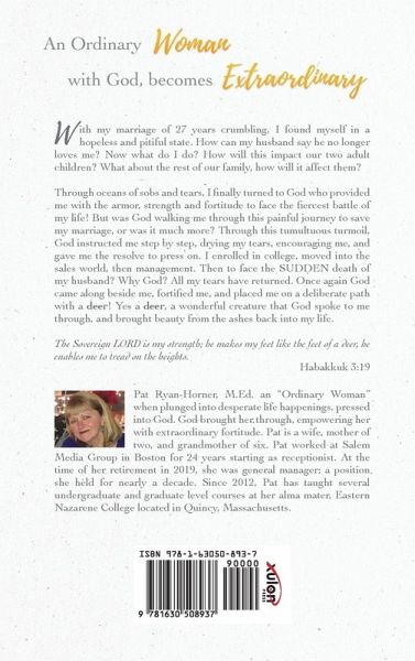 With my marriage of 27 years crumbling, I found myself in a hopeless and pitiful state. How can my husband say he no longer loves me? Now what do I do? How will this impact our two adult children? What about the rest of our family, how will it affect them? Through oceans of sobs and tears, I finally turned to God who provided me with the armor, strength and fortitude to face the fiercest battle of my life! But was God walking me through this painful journey to save my marriage, or was it much more? Through this tumultuous turmoil, God instructed me step by step, drying my tears, encouraging me, and gave me the resolve to press on. I enrolled in college, moved into the sales world, then management. Then to face the SUDDEN death of my husband? Why God? All my tears have returned. Once again God came along beside me, fortified me, and placed me on a deliberate path with a deer! Yes a deer, a wonderful creature that God spoke to me through, and brought beauty from the ashes back into my life. The Sovereign LORD is my strength; he makes my feet like the feet of a deer, he enables me to tread on the heights. Habakkuk 3:19 Pat Ryan-Horner, M.Ed. an "Ordinary Woman" when plunged into desperate life happenings, pressed into God. God brought her through, empowering her with extraordinary fortitude. Pat is a wife, mother of two, and grandmother of six. Pat worked at Salem Media Group in Boston for 24 years starting as receptionist. At the time of her retirement in 2019, she was general manager; a position she held for nearly a decade. Since 2012, Pat has taught several undergraduate and graduate level courses at her alma mater, Eastern Nazarene College located in Quincy, Massachusetts.