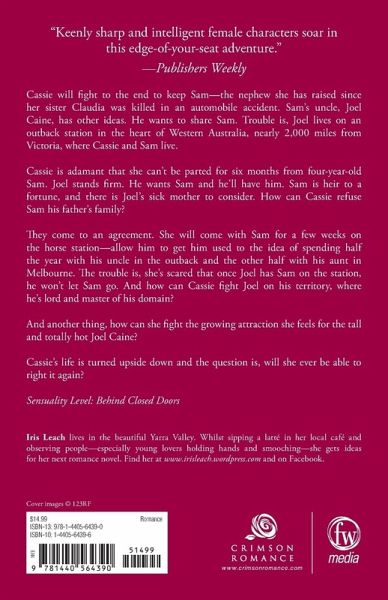 Cassie will fight to the end to keep Sam, the nephew she has raised since her sister Claudia was killed in an automobile accident. Sam's uncle, Joel Caine, has other ideas. He wants to share Sam. Trouble is, Joel lives on an outback station in the heart of Western Australia, nearly 2,000 miles from Victoria where Cassie and Sam live. Cassie is adamant that she can't be parted for six months from four-year-old Sam. Joel stands firm. He wants Sam and he'll have him. Sam is heir to a fortune, and there is Joel's sick mother to consider. How can Cassie refuse Sam his father's family? They come to an agreement. She will come with Sam for a few weeks on the horse station. Get him used to the idea of spending half the year with his uncle in the outback and the other half with his aunt in Melbourne. Trouble is, she's scared that once Joel has Sam on the station, he won't let Sam go. And how can Cassie fight Joel on his territory where he's lord and master of his domain? And another thing, how can she fight her growing attraction she feels for the tall and totally hot Joel Caine? Cassie's life is turned upside-down and the question is, will she ever be able to right it again? Sensuality Level: Behind Closed Doors