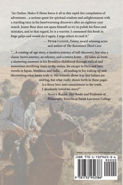 An Outlaw Makes It Home is an odyssey, a journey out and a return home. A candid, compelling and raucous spiritual adventure story, with an element of danger when Eli goes underground as a federal fugitive during the Vietnam War. From underground revolutionary to spiritual awakening, he takes us with him from uncharted outback of Peru to a monastery in Japan, an initiation into a Sufi clan in Marrakesh, and the streets of India in his quest for a final teacher. "An Outlaw Makes It Home bares it all in this machine-gun like compilation of adventures. A serious, playing-for-keeps quest for spiritual wisdom and enlightenment with a startling turn in the heartwarming discovery after an eighteen year search. Jaxon-Bear does not spare himself or try to polish his flaws and mistakes: in that regard, he is a warrior. I consumed this book in huge gulps and would do it again. I urge others to read it."~Peter Coyote, Emmy award winning actor and author of The Rainman's Third Cure
