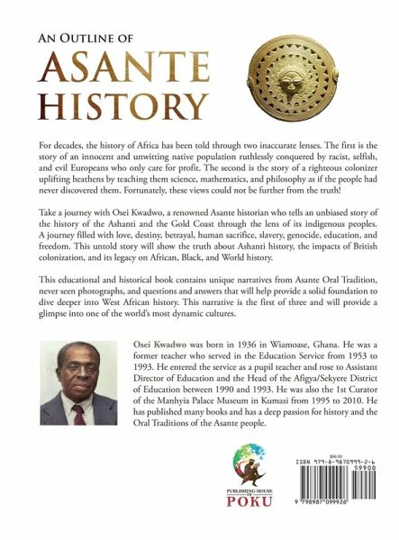 For decades, the history of Africa has been told through two inaccurate lenses. The first is the story of an innocent and unwitting native population ruthlessly conquered by racist, selfish, and evil Europeans who only care for profit. The second is the story of a righteous colonizer uplifting heathens by teaching them science, mathematics, and philosophy as if the people had never discovered them. Fortunately, these views could not be further from the truth! Take a journey with Osei Kwadwo, a renowned Asante historian who tells an unbiased story of the history of the Ashanti and the Gold Coast through the lens of its indigenous people. A journey filled with love, destiny, betrayal, slavery, human sacrifice, genocide, education, and freedom. This untold story will show the truth about Ashanti history, the impacts of British colonization, and its legacy on African, Black, and World history. This educational and historical book will teach readers about the contributions of the great Asante kings, starting from the reign of Nana Osei Tutu, the nation's founder, to the reign of Nana Opoku Ware II. This book also contains unique narratives from Asante Oral Tradition, never seen colored images, and questions and answers that will provide a solid foundation to dive deeper into West African history. This book is the first of three and is best used for learning and teaching and will give a glimpse into one of the world's most dynamic cultures. This version is the remastered third edition, with the first edition being published in 1994. This hardcover version includes premium color portraits, quality binding, and an excellent cover that can protect this book for generations to come.