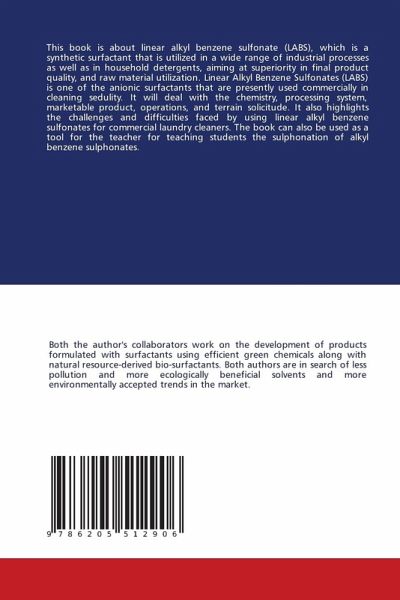 This book is about linear alkyl benzene sulfonate (LABS), which is a synthetic surfactant that is utilized in a wide range of industrial processes as well as in household detergents, aiming at superiority in final product quality, and raw material utilization. Linear Alkyl Benzene Sulfonates (LABS) is one of the anionic surfactants that are presently used commercially in cleaning sedulity. It will deal with the chemistry, processing system, marketable product, operations, and terrain solicitude. It also highlights the challenges and difficulties faced by using linear alkyl benzene sulfonates for commercial laundry cleaners. The book can also be used as a tool for the teacher for teaching students the sulphonation of alkyl benzene sulphonates.