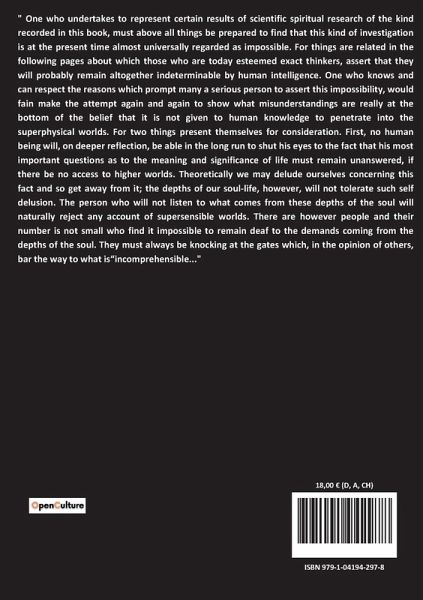 " One who undertakes to represent certain results of scientific spiritual research of the kind recorded in this book, must above all things be prepared to find that this kind of investigation is at the present time almost universally regarded as impossible. For things are related in the following pages about which those who are today esteemed exact thinkers, assert that they will probably remain altogether indeterminable by human intelligence. One who knows and can respect the reasons which prompt many a serious person to assert this impossibility, would fain make the attempt again and again to show what misunderstandings are really at the bottom of the belief that it is not given to human knowledge to penetrate into the superphysical worlds. For two things present themselves for consideration. First, no human being will, on deeper reflection, be able in the long run to shut his eyes to the fact that his most important questions as to the meaning and significance of life must remain unanswered, if there be no access to higher worlds. Theoretically we may delude ourselves concerning this fact and so get away from it; the depths of our soul-life, however, will not tolerate such self delusion. The person who will not listen to what comes from these depths of the soul will naturally reject any account of supersensible worlds. There are however people and their number is not small who find it impossible to remain deaf to the demands coming from the depths of the soul. They must always be knocking at the gates which, in the opinion of others, bar the way to what is¿incomprehensible..."