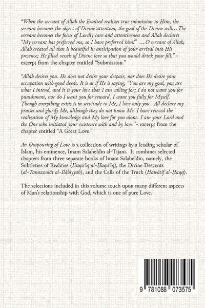 "When the servant of Allah the Exalted realizes true submission to Him, the servant becomes the object of Divine attention, the goal of the Divine will...The servant becomes the focus of Lordly care and attentiveness and Allah declares "My servant has preferred me, so I have preferred him!" ...O servant of Allah, Allah created all that is beautiful in anticipation of your arrival into His presence; He filled vessels of Divine love so that you would drink your fill." - excerpt from the chapter entitled "Submission." "Allah desires you. He does not desire your despair, nor does He desire your occupation with good deeds. It is as if He is saying, "You are my goal, you are what I intend, and it is your love that I am calling for; I do not want you for punishment, nor do I want you for reward. I want you fully for Myself. Though everything exists is in servitude to Me, I love only you. All declare my praises and glorify Me, although they do not know Me. I have resrved the realization of My knowledge and My love for you alone. I am your Lord and the One who initiated your existence with and by love."- excerpt from the chapter entitled "A Great Love." An Outpouring of Love is a collection of writings by a leading scholar of Islam, his eminence, Imam Salaheldin al-Tijani. It combines chapters from three separate books of Imam Salaheldin, namely, the Subtleties of Realities (Daq¿¿iq al-¿aq¿¿iq), the Divine Descents (al-Tanazzul¿t al-Il¿hiyyah), and the Calls of the Truth (Haw¿tif al-¿aqq). The selections included in this volume touch upon many different aspects of Man's relationship with God, which is one of pure Love.
