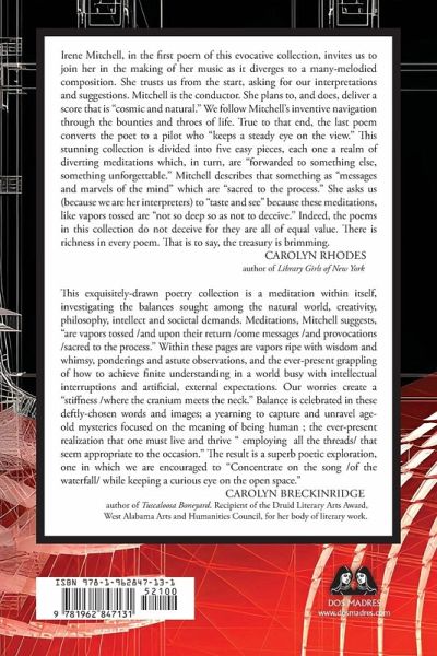 In the pages that comprise An Overdose of Meditation, the poet readily confesses that "remembering, supposing, counting, assessing/ is no way to spend the time. It is an overdose/ of meditation." Yet the poet has devised a formula through which she realizes that thoughtful perception is a vital principle of life. The direct way, she says, to the inner fruit is through the interior power of the soul.Whether the poet is conducting her orchestra or piloting the reader through space and time (either occupation her natural instrument), Mitchell's meditative poems reveal her poetic underpinnings. These poems are alive with metaphor, wry humor, and elemental confession as if to assure that when we read her work, sparks will fly up and take hold, kindling our own emotive fire. SAMPLE POEM: STANDARD DEVIATION Resting after a fall never means not getting up at all, but resting just until worries begin their flight. And for that relief, all that is needed is a down pillow, and high windows to deliver a share of moon's ambient light. Or is this break a dumbness and excuse, another silly respite just to put vexations right? With no more to lose, it is time now to fracture useless worry. This resolve places me handily on the brink of happiness, just at the door of delight, neatly positioned at the edge of comfort.